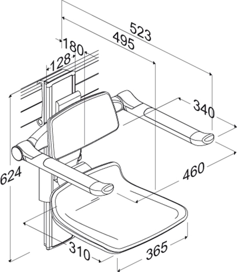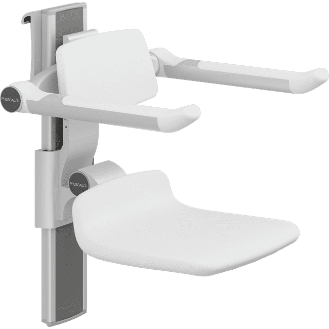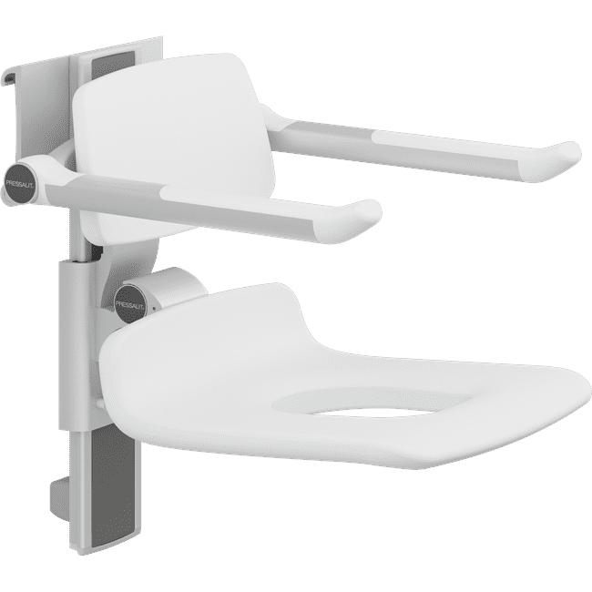 PLUS shower seat with opening, backrest and armrest. Manually adjustable in height and laterally, without tools. The armrests are independently adjustable in height. The seat and armrests can be folded.