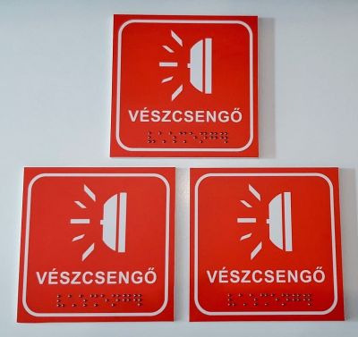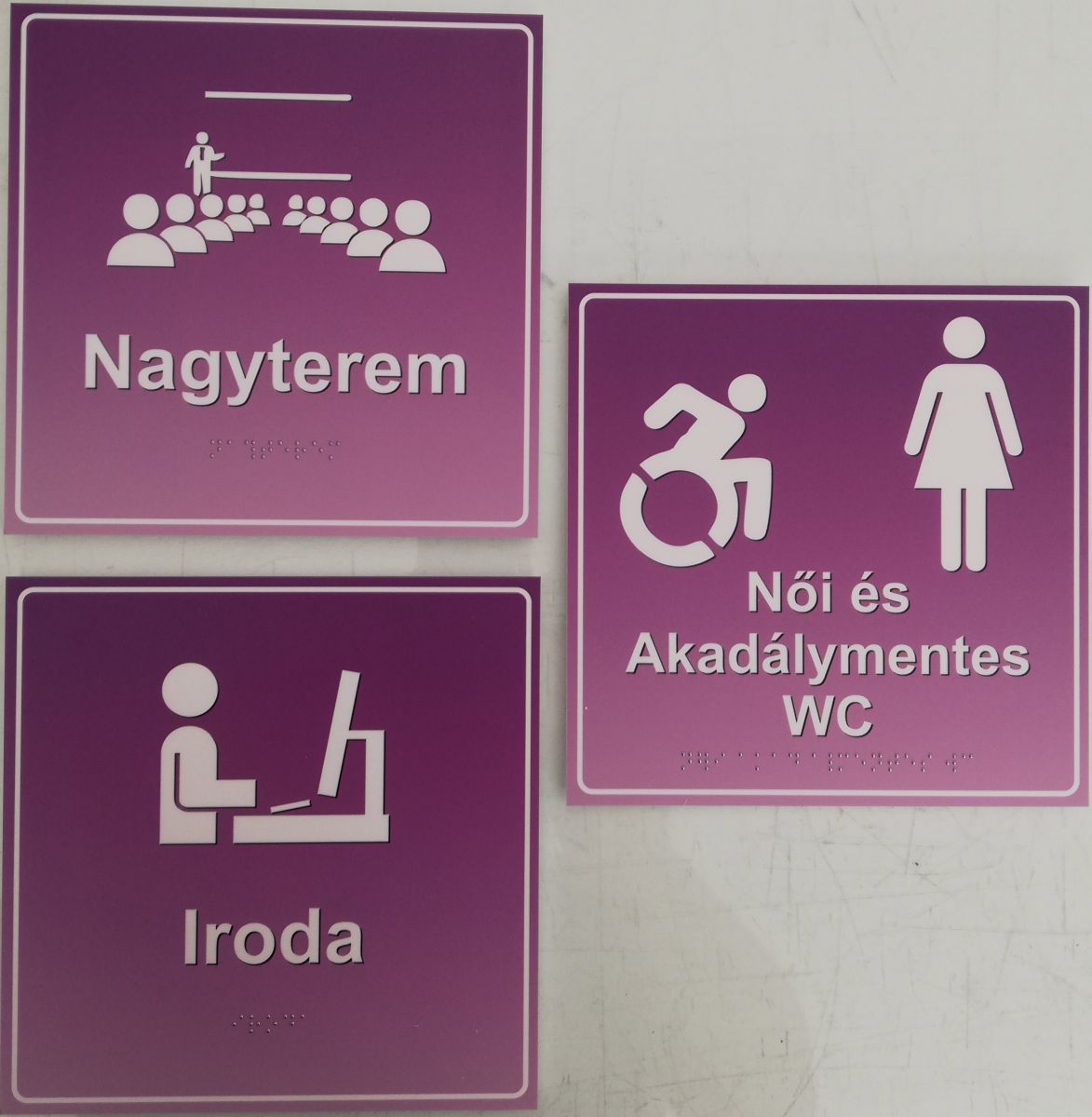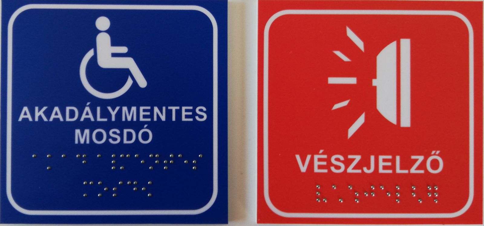 Braille board with 10x10cm stainless steel implanted Braille characters, digitally printed, with laminated inscription, according to the demands of the customer regarding the design and the text. In our company, the production of the boards can only take place after the graphic design plan accepted by the customer. Braille information boards help not only the orientation of people with visual impairments and blind people, but the people with healthy vision also can have an easier orientation. The boards have simple, easy-to-understand pictogram and traditional, easy to read font. In the case of public institutions, the existence of the information tables which helps orientation is indispensable. A basic requirement is that public institutions are accessible to everyone and that there is clear guidance. For blind and visually impaired persons, the presence of the boards with Braille signs and the functional signs beside the door are the fundamental part of the equal chances.