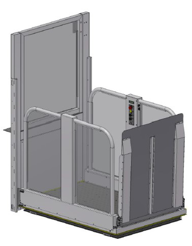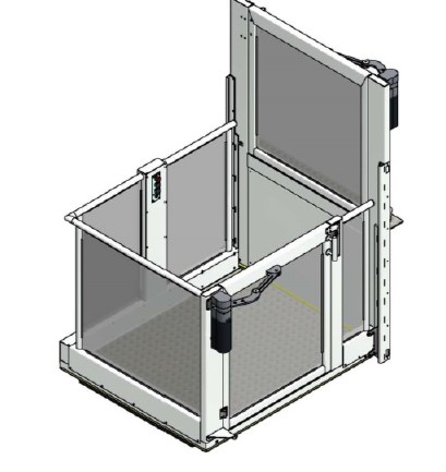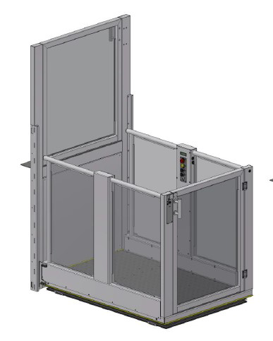 Emelőlift, mely teljesen acél aknaburkolat van ellátva az alsó szinten és a felső szinten kapuval, lehetőség van 180%-os be/ kijárat vagy 90%-os oldalsó bementtel, valamint automata kapu/ajtónyitóval vagy anélkül