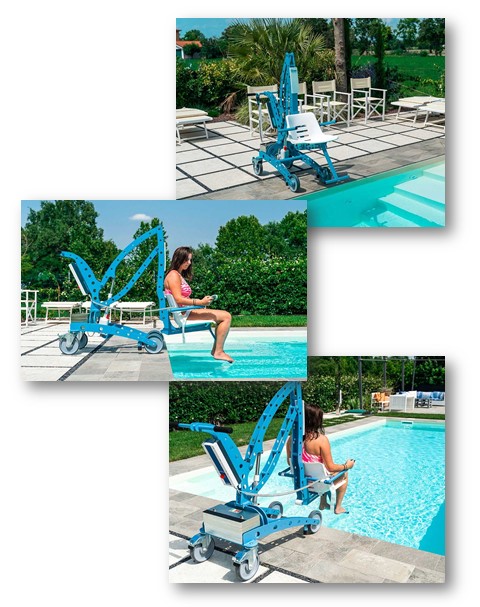A medencelift különböző testalkatú felhasználók számára is ideális. Az állítható kartámasz és a levehető lábtámasz extra kényelmet biztosít, míg a biztonsági öv (2,4 vagy 5 pontos) stabilan tartja a felhasználót használat közben. A rozsdamentes acél váz garantálja a hosszú élettartamot és ellenáll a medence vízének. A hátsó keréken található fék és az első keréken található biztonsági ütköző növeli a stabilitást és a biztonságot a medence szélén.