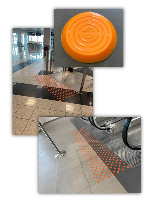 A padlóburkolatra lehelyezett figyelmeztető jelzések nagymértékben elősegítik a vak vagy látássérült emberek tájékozódását. A diagonálisan elhelyezett jelzések a veszélyre hívják fel a figyelmet.