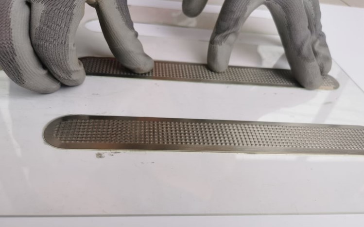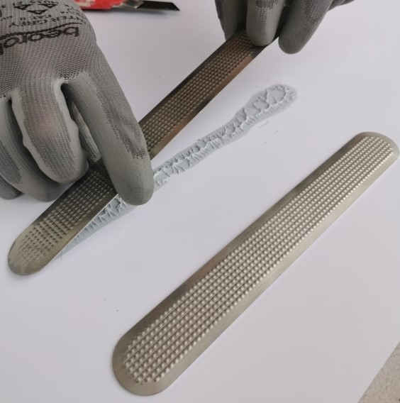 Rozsdamentes sáv telepítése sablonok segítségével, melyet két komponensű hibrid polimer bázisú ragasztóval helyezünk meglévő burkolatra. A ragasztó kiváló minőségű és gyors kötésű, kiválóan tapad beton (természetes) kő, fa, fém, alumínium, műanyag, kerámia és üveg felülethez. Amennyiben azt szeretnék, hogy a vezetősávokat minél hamarabb használhassák, a sávok telepítését a két komponensű hibrid ragasztót ajánljuk.