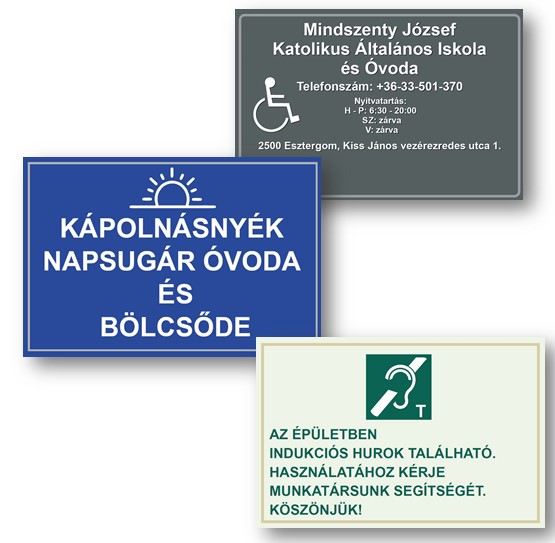 A táblák kialakításakor felkínáljuk az adott funkció jellegéhez tartozó vagy alkalmazható piktogramot, de egyedi fotót, logót, képet is elhelyezhetünk a táblán.
