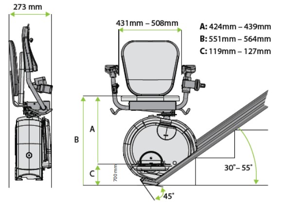 Az Essential lépcsőlift összecsukott állapotban mindössze 273 mm helyet foglal el a fal előtt, így a piacon elérhető egyik legkeskenyebb megoldásnak számít. Ez a kompakt kialakítás lehetővé teszi a lépcsőház szabad használatát, anélkül hogy akadályozná a többi lakó közlekedését.
