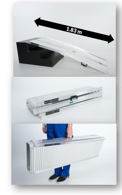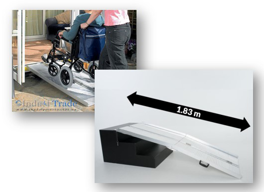 Mobil, alumínium rámpa kerekesszékes emberek, mozgáskorlátozottak számára. Alkalmazásával könnyen megoldható lépcsőfokok, küszöbök áthidalása, biztosítva ezzel a kerekesszékes személyek közlekedését. A kerekesszék gépjárművekben való szállításában is nagy segítséget nyújt.