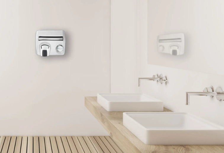 Meleglevegős kézszárító, mely 18 másodperc alatt teljesen elpárologtatja a nedvességet a kezekről.
